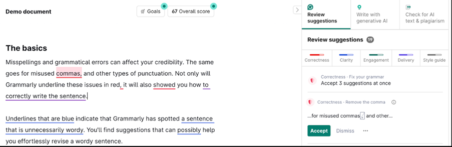 Grammarly reviewing a document and suggesting corrections for grammar, punctuation, and clarity.